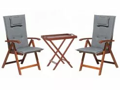 Luo mukava oleskelualue ja kohota ulkotilasi ilmettä tällä tyylikkäällä, rustiikkisen tyylin inspiroimalla bistrosetillä. Korkealaatuisesta tumman sävyisestä akasiapuusta valmistetut kalusteet on helppo sijoittaa moniin erilaisiin sisustuksiin. Tuolien selkänojat ovat kätevästi säädettävissä 6 eri asentoon. Kalusteet ovat kokoontaitettavissa, joten ne on helppo ottaa mukaan rannalle tai mökille ja säilyttää poissa näkyviltä, kun ne eivät ole käytössä. Irrotettavaa pöytälevyä voidaan käyttää tarjottimena. Mukana tulevat grafiitinharmaat pehmusteet takaavat maksimaalisen istumamukavuuden.