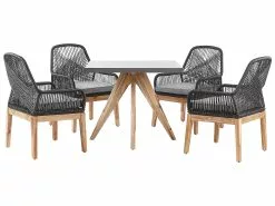 Tämä ulkoruokailuryhmä tuo tyyliä mihin tahansa ulkotilaan. Tilavalla pöytälevyllä varustettu puutarhapöytä ja mukana tulevat tuolit tarjoavat tilaa jopa 4 hengelle. Kaikki osat on valmistettu sääolosuhteita ja kosteutta kestävistä materiaaleista, jotka ovat helppohoitoisia. Pöytälevy on valmistettu kuitusementistä. Tuolien selkänojat on valmistettu rottinkia muistuttavasta muovipunoksesta. Kalusteita korostavat akasiapuusta valmistetut jalat. Mukana tulevat pehmusteet tarjoavat lisämukavuuden. Muotoilunsa ansiosta tämä kalustesetti sopii moniin ulkotiloihin, moderneista perinteisiin.
