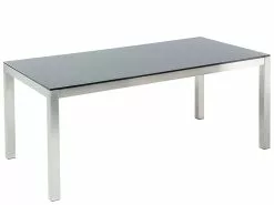 Tämä poikkeuksellinen puutarhapöytä luo ainutlaatuisen ilmeen mihin tahansa puutarhaan. Sen runko on valmistettu vankasta ja kestävästä ruostumattomasta teräksestä, joka takaa, että pöytä pysyy upeana pitkään. Hopea runko korostaa mustaa karkaistu lasitasoa kauniisti. Säänkestävien materiaalien yhdistelmä antaa pöydälle modernin ilmeen. Leveä pöytälevy tarjoaa tarpeeksi tilaa jopa kuudelle hengelle. Yhdistä pöytä yhteensopivien puutarhatuolien kanssa luodaksesi tyylikkään kokonaisuuden, jonka ääressä voit nauttia yhteisistä hetkistä perheen ja ystävien kesken.