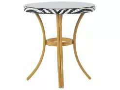Tämä tyylikäs puutarhapöytä on täydellinen lisä puutarhaan, terassille tai parvekkeelle. Geometrisesti kuvioidun polyrottinkipunoksen ja bambua muistuttavan alumiinirungon ainutlaatuinen yhdistelmä antaa pöydälle vintage-vaikutteita. Pyöreä pöytälevy on viimeistelty karkaistu lasitasolla. Kokonsa puolesta pöytä tarjoaa tilaa jopa 4 hengelle. Materiaaliensa ja kauniin muotoilunsa ansiosta se sopii moniin erityylisiin sisä- ja ulkotiloihin. Yhdistä pöytä yhteensopivien puutarhatuolien kanssa hurmaavan kokonaisuuden luomiseksi.